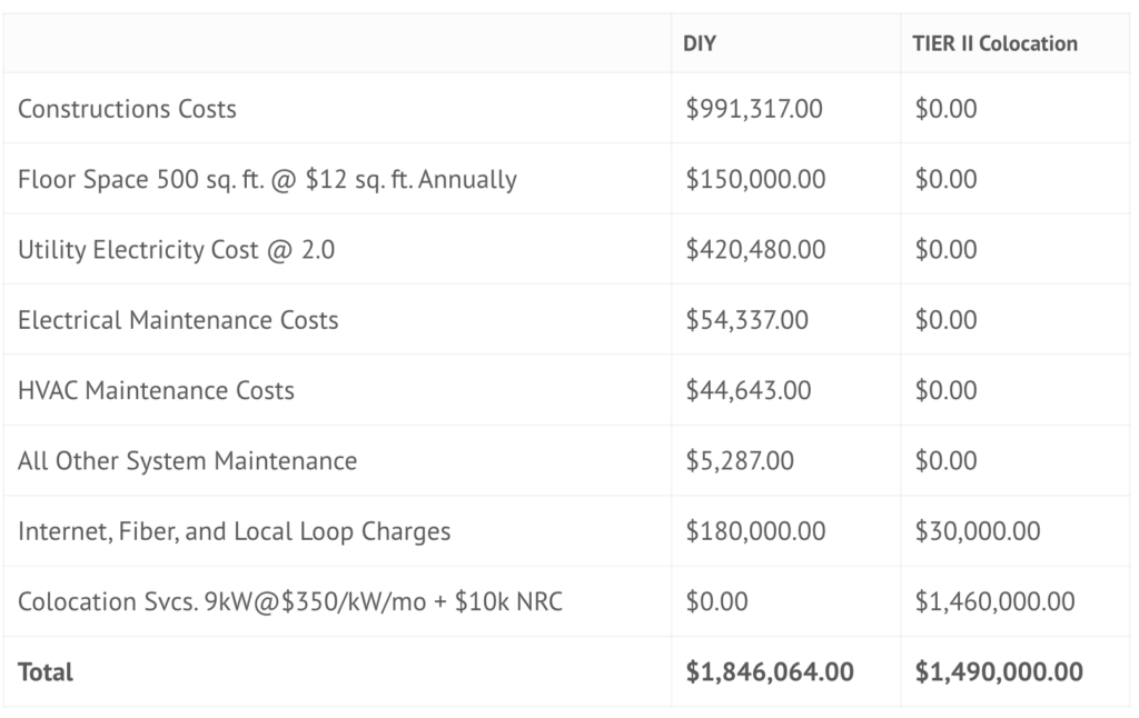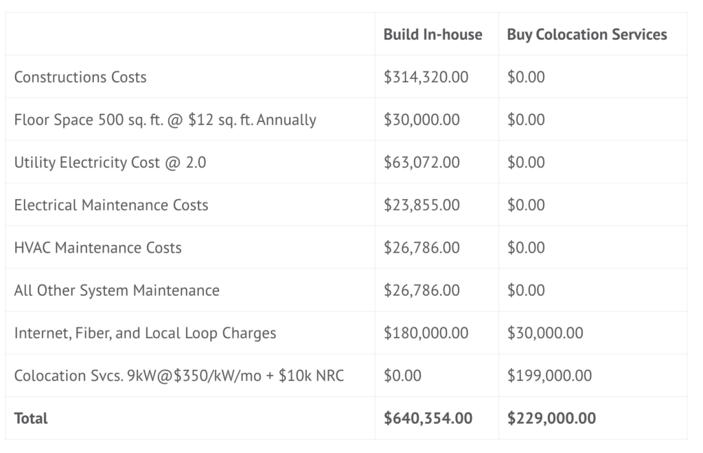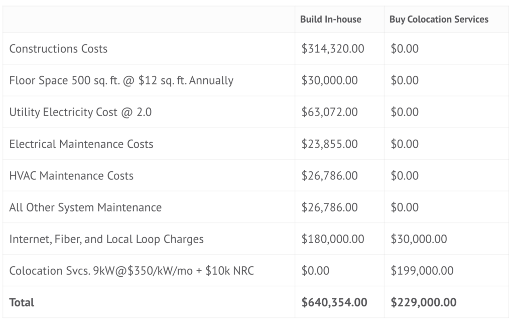 Building an in-house data center is an expensive undertaking especially when you consider the total cost of ownership over the next five years. Buying colocation services from a third-party service provider is more cost-effective than building your own. Based on estimates by the Uptime Institute, colocating can be 19%—64% more cost-effective than building an in-house Tier 2 data center.
