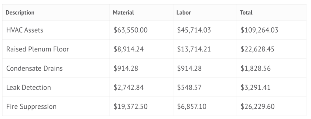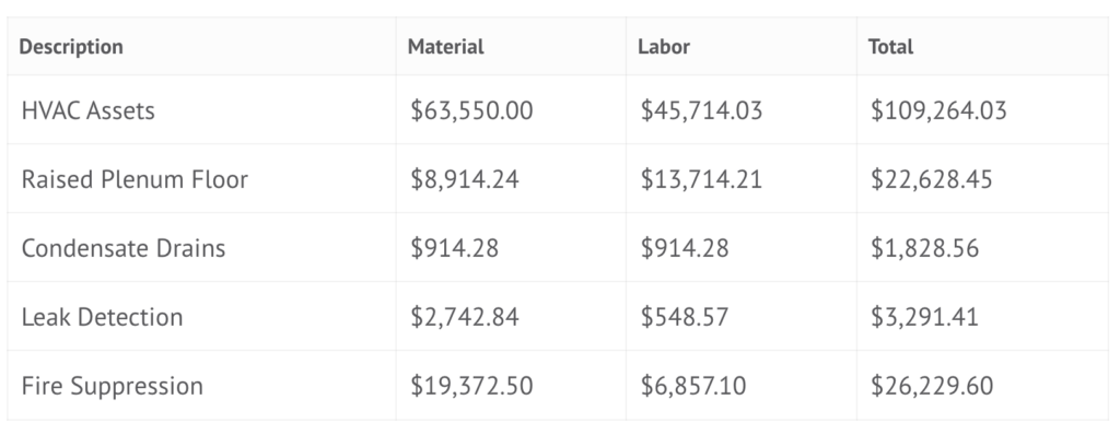 The “Computer Room” Component in all cases is $300/sq. ft. of computer floor and this cost must be added to the “kW cost” shown above.